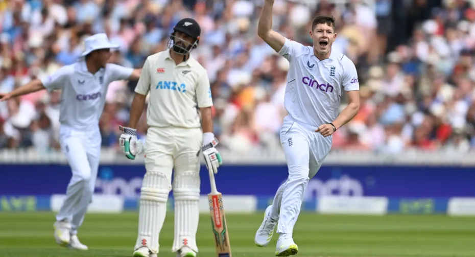 एंडरसन ने दोनों सलामी बल्लेबाजों टॉम लैथम (01) और विल यंग (01) को जॉनी बेयरस्टो के हाथों कैच कराके टीम को अच्छी शुरुआत दिलाई। ब्रॉड ने इसके बाद डेवोन कॉनवे (03) को भी बेयरस्टो के हाथों कैच कराया। पोट्स ने विलियमसन (02) को विकेटकीपर बेन फोक्स के हाथों कैच कराके पहला अंतरराष्ट्रीय विकेट हासिल किया और न्यूजीलैंड का स्कोर चार विकेट पर 12 रन किया।