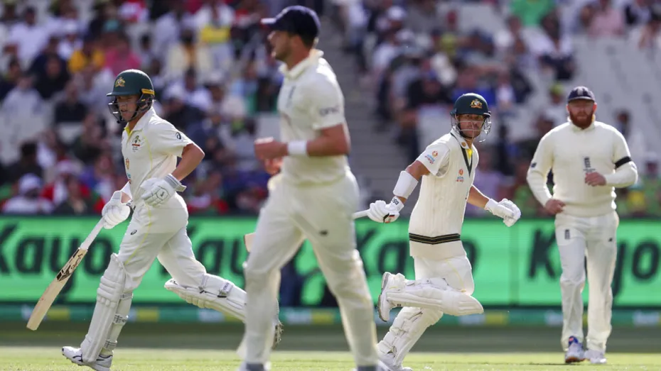 ऑस्ट्रेलिया और इंग्लैंड के बीच एशेज सीरीज का तीसरा टेस्ट मेलबर्न क्रिकेट ग्राउंड पर खेला जा रहा है और दूसरे दिन का खेल खत्म होने तक इंग्लैंड की टीम ने दूसरी पारी में 31 रन के भीतर ही अपने 4 विकेट गंवा दिए हैं। मिचेल स्टार्क और स्कॉट बोलैंड 2-2 विकेट अपने नाम कर चुके हैं। इससे पहले ऑस्ट्रेलिया की पहली 267 रनों पर ढेर हो गई। इंग्लैंड ने पहली पारी में 185 रन बनाये थे।ऑस्ट्रेलिया प्लेइंग इलेवन - मार्कस हैरिस, डेविड वॉर्नर, मार्नस लाबुशेन, स्टीवन स्मिथ, ट्रैविस हेड, कैमरून ग्रीन, एलेक्स केरी (wk), पैट कमिंस (c), मिशेल स्टार्क, स्कॉट बोलैंड, नाथन लियोन