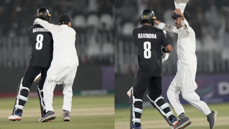न्यूजीलैंड की टीम को इस मुकाबले में बांग्लादेश ने 237 रनों का टारगेट दिया था, जिसमें उन्होंने 15 के स्कोर पर अपने 2 विकेट गंवा दिए थे। इसके बाद रचिन रवींद्र ने एक छोर से पारी को संभालने के साथ टीम को जीत की तरफ लेकर जाने की जिम्मेदारी उठाई। इसी दौरान जब रचिन बल्लेबाजी कर रहे थे तो एक दर्शक हाथ में पोस्टर लेकर मैदान के अंदर जा पहुंचा जिसमें वह सीधे दौड़ते हुए पिच के करीब पहुंचने के बाद हवा में उस पोस्टर को लहराने के साथ रचिन रवींद्र को जबरदस्ती गले लगाने की भी कोशिश की। इस घटना से जहां रवींद्र थोड़ा डर गए तो वहीं बाद में उस दर्शक को सुरक्षाकर्मी मैदान से बाहर लेकर गए। अब इस घटना से पाकिस्तान में लंबे समय के बाद हो रहे आईसीसी टूर्नामेंट में प्लेयर्स की सिक्योरिटी को लेकर कई सवाल लगातार उठ रहे हैं।