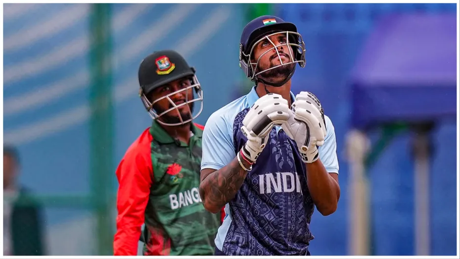 भारत बनाम बांग्लादेश सेमीफाइनल मैच में बांग्लादेश ने पहले बल्लेबाजी करते हुए 20 ओवर में 9 विकेट पर 96 रनों का मामूली का स्कोर खड़ा किया था, यानी भारतीय टीम के सामने जीत के लिए महज 97 रनों का ही टारगेट था। भारतीय टीम को पहला झटका उस वक्त लगा, जब पहले की ओवर की चौथी बॉल पर सलामी बल्लेबाज यशस्वी जायसवाल आउट हो गए। इसके बाद कप्तान रुतुराज गायकवाड का साथ देने के लिए आए तिलक वर्मा। दोनों ने मिलकर इतनी तेज बल्लेबाजी की कि लगा ही नहीं कि भारतीय टीम एक विकेट गवां चुकी है। भारत ने अपने 50 रन केवल 3.4 ओवर में ही पूरे कर लिए। ये टीम इंडिया का टी20 इंटरनेशनल में सबसे तेज पचासा है। इससे पहले इसी टीम ने एशियन गेम्स के क्वार्टर फाइनल में नेपाल के खिलाफ 3.5 ओवर में पूरे किए थे, लेकिन कुछ ही दिन में ये रिकॉर्ड भी ध्वस्त हो गया है।