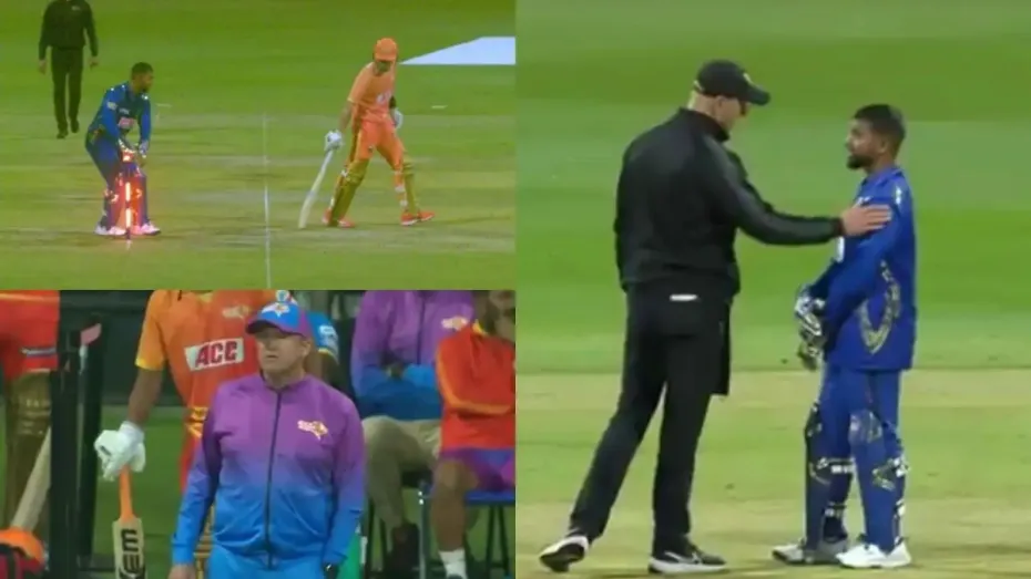 अबू धाबी में खेली जा रही ILT20 लीग 2025 में गल्फ जायंट्स ने 25 जनवरी को डिफेंडिंग चैंपियन MI एमिरेट्स को रोमांचक मुकाबले में हरा दिया। हालांकि इस मैच में जमकर ड्रामा भी हुआ। पहले बल्लेबाजी करते हुए MI एमिरेट्स ने 20 ओवर में 6 विकेट खोकर 151 रन स्कोरबोर्ड पर लगाए। MI की ओर से टॉम बैंटन ने सबसे ज्यादा 56 रन बनाए। MI के स्कोर के जवाब में गल्फ जायंट्स ने 2 विकेट शेष रहते 152 रनों का टारगेट आखिरी गेंद पर हासिल कर लिया। इस मैच में आखिरी ओवरों में काफी ड्रामा भी देखने को मिला। ये घटना उस समय घटी जब गल्फ जायंट्स को 13 गेंदों पर जीत के लिए 18 रनों की दरकार थी। टॉम करन और मार्क अडायर बल्लेबाजी कर रहे थे।