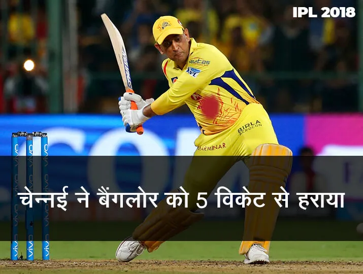 चेन्नई सुपर किंग्स ने बुधवार को इंडियन प्रीमियर लीग (आईपीएल) के 11वें संस्करण में एक बेहद रोमांचक मुकाबले में मेजबान रॉयल चैलेंजर्स बेंगलोर को पांच विकेट से हरा दिया। एम. चिन्नास्वामी स्टेडियम में खेले गए इस मैच में बेंगलोर ने पहले बल्लेबाजी करते हुए चेन्नई के सामने 206 रनों की विशाल चुनौती रखी थी जिसे चेन्नई ने दो गेंद शेष रहते पांच विकेट खोकर हासिल कर लिया।