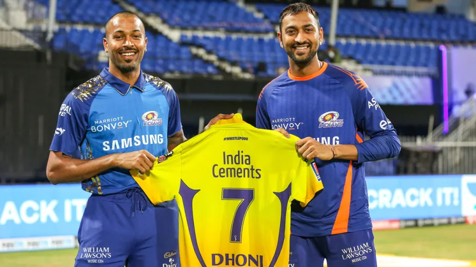 चेन्नई सुपर किंग्स और मुंबई इंडियंस के बीच शुक्रवार को आईपीएल 2020 का 41वां मुकाबला शारजाह क्रिकेट स्टेडियम में खेला गया। इस मैच में चेन्नई को मुंबई के हाथों 10 विकेट से करारी हार का सामना करना पड़ा। मैच के बाद सीएसके के कप्तान महेंद्र सिंह धोनी ने हार्दिक पांड्या और क्रुणाल पांड्या को अपनी 7 नंबर की पीली जर्सी गिफ्ट की।