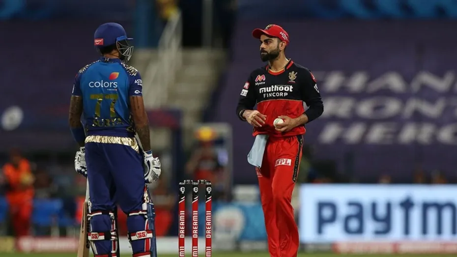 मुंबई की पारी के 13वें ओवर के दौरान एक ऐसी घटना घटी जिसे देखने के बाद फैन्स ने विराट कोहली को फटकार लगा दी। दरअसल, 13वें ओवर की आखिरी गेंद पर जब सूर्यकुमार ने कवर ड्राइव लगाया तो वहां मौजूद आरसीबी के कप्तान विराट कोहली ने गेंद को पकड़ लिया। इसके बाद कोहली और सूर्याकुमार एक दूसरे को घूरने लगे और कोहली गेंद को पसीने से साफ करते-करते उनके पास पहुंचे। दोनों के बीच कुछ बात तो नहीं हुई, लेकिन आंखों ही आंखों में काफी तीखी प्रतिक्रिया देखने को मिली।