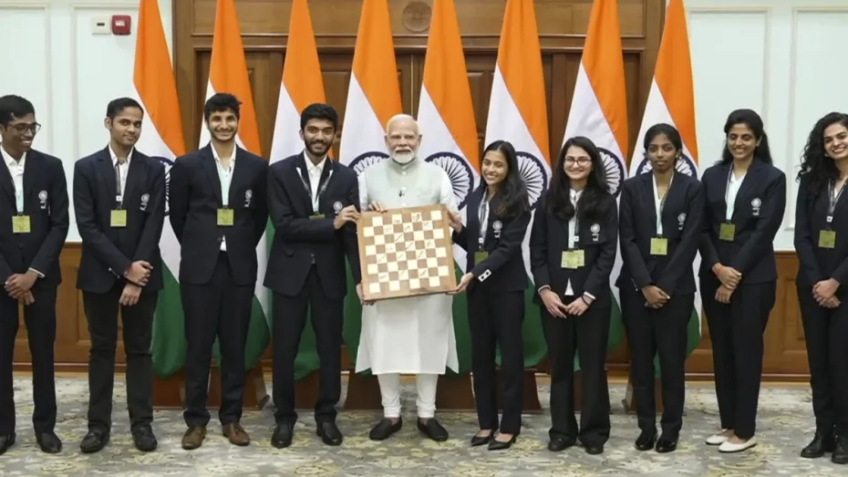 भारत ने पुरुष और महिला दोनों में चेस ओलिंपियाड में पहली बार गोल्ड मेडल जीतने में सफलता पाई जो 97 साल के इतिहास में पहली बार हुआ है। इस चेस ओलिंपियाड में हिस्सा लेने गई भारत की पुरुष और महिला दोनों टीमों के प्लेयर्स बुधवार 25 सितंबर को देश वापस लौट आए, जिसके बाद दिल्ली में प्रधानमंत्री नरेंद्र मोदी ने अपने आवास पर सभी से मुलाकात करने के साथ उन्हें इस बड़ी उपलब्धि की बधाई दी। पीएम मोदी ने इस दौरान सभी प्लेयर्स से बात भी की और उनके साथ फोटो भी खिंचाई। एएनआई की तरफ से जारी किए गए वीडियो में पीएम मोदी के सामने अर्जुन एरीगैसी और आर. प्रगनानंदा ने एक मैच भी खेला।