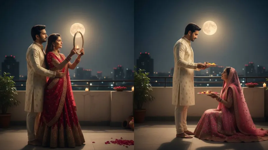 Prompt 2 : A cinematic Karwa Chauth scene on a luxurious terrace at night. A young Indian couple performs the ritual, with the woman in a red and gold sequined saree holding a decorated sieve with a candle. The man wears a cream kurta and stands gently beside her. Both gaze at the moon through the sieve, showing warmth and affection like the reference photos. Warm golden light highlights the couple against a dark, moody background, creating a vintage, festive feel.