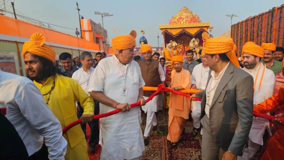 उत्तर प्रदेश के मुख्यमंत्री योगी आदित्यनाथ ने बुधवार को भव्य दीपोत्सव समारोह से पहले अयोध्या पहुंचे श्री राम, सीता और लक्ष्मण का स्वागत किया। श्री राम के सीता और लक्ष्मण हनुमान और अन्य लोगों के साथ 'पुष्पक विमान' (हेलीकॉप्टर) से अयोध्या पहुंचने पर सीएम योगी ने उनका अभिवंदन किया। इसके बाद सीएम योगी ने श्रीराम के रथ को भी खींचा।
