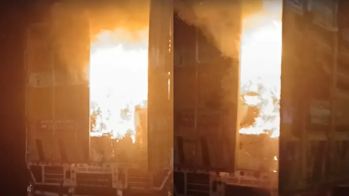 उत्तर प्रदेश के हाथरस जिले में आग का तांडव देखा गया। 8 किलोमीटर तक सड़क पर आग की लपटों में घिरा हुआ कंटेनर दौड़ता रहा। कंटेनर के अंदर भीषण आग लगी हुई थी। कंटेनर का ड्राइवर आग लगे हुए ट्रक को चलाए जा रहा था। कंटेनर में रखा लाखों रुपये का माल जलकर खाक हो गया।