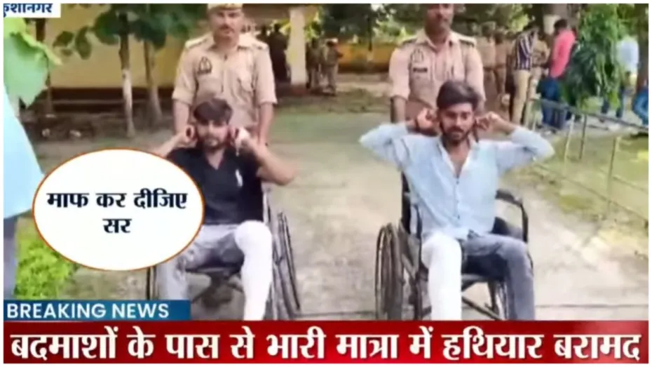 यूपी के कुशीनगर में एक बार फिर पुलिस ने बदमाशों पर कड़ी कार्रवाई की है। दरअसल कुशीनगर में ऑर्केस्ट्रा में काम करने वाली 2 डांसरों को अपराधियों ने किडनैप कर लिया। इसके बाद फायरिंग करते हुए बदमाश वहां से फरार हो गए। इस घटना की सूचना जैसे ही पुलिस को मिली तो पुलिस कार्रवाई शुरू कर दी। पुलिस ने उन बदमाशों को ट्रेस किया और कुल 8 बदमाशों को गिरफ्तार कर लिया। इस दौरान पुलिस और अपराधियों के बीच हुए एनकाउंटर में 2 अपराधियों के पैर में गोली लगी। इसके बाद आनन-फानन में दोनों बदमाशों को अस्पताल ले जाया गया, जहां उनका इलाज किया गया। इसके बाद व्हील चेयर पर जब दोनों बदमाशों को बाहर लाया गया तो दोनों माफी मांगते दिखे।