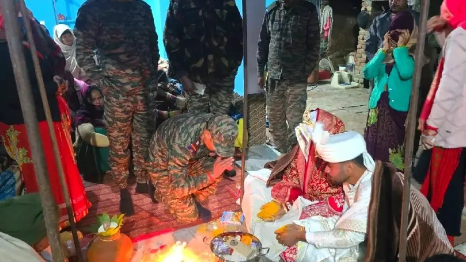 सेना की वर्दी में बेटी का कन्यादान हुआ तो यहां मौजूद लोगों की आंखों से आंसुओं की धारा बह चली। जवानों ने बेटी को आगे भी हर संभव सहयोग का आश्वासन दिया है। (भाषा इनपुट्स के साथ)