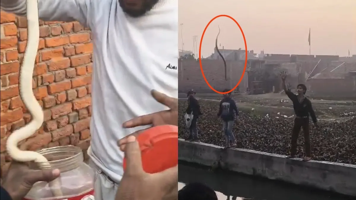 मुरादाबाद के थाना मझोला इलाके में आने वाली मंसूरी कालोनी और जयंतीपुर के बीच से निकलने वाले एक बड़े नाले में सांप दिखाई दिए तो भीड़ लग गई। इस बीच एक हैरान कर देने वाला नजारा सामने आया। बस्ती के छोटे लड़के नाले से सांपों को पकड़ते और एक दूसरे के ऊपर उछालकर फेंकते, सांपों से खेलने का जोखिम भरे नजारे को किसी ने रिकॉर्ड किया और वायरल कर दिया।