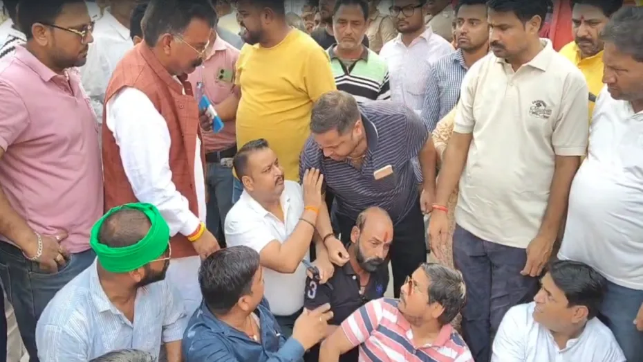 धरने पर बैठे बीजेपी नगर अध्यक्ष इंद्रेश चौहान ने व्यापार मंडल अध्यक्ष अनूप अग्रवाल पर मामूली कहासुनी के चलते उनके साथ मारपीट का आरोप लगाया है। बीजेपी नेता मांग कर रहे हैं कि व्यापार मंडल अध्यक्ष पर रिपोर्ट दर्ज कर उनकी गिरफ्तारी की जाए।