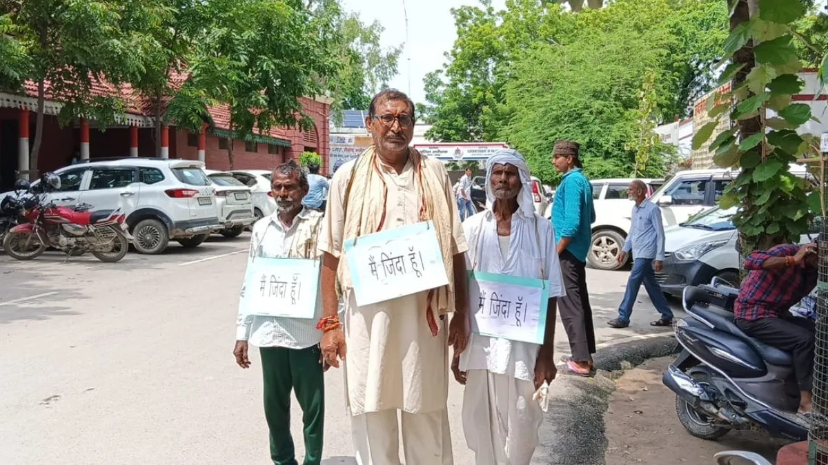 उत्तर प्रदेश के जौनपुर जिले से एक बड़ा ही हैरान कर देने वाला मामला निकलकर सामने आया है। विभागीय लापरवाही के चलते आज जौनपुर कलेक्ट्री में लोग उस समय आश्चर्यचकित रह गए जब फाइलों में तीन मृतक आदमी जिंदा रूप में जिलाधिकारी कार्यालय पहुंचे। ये तीनों मृतक गले में तख्ती लटकाए हुए थे और उस पर लिखा था साहब मैं जिंदा हूं। तीनों मृतकों ने जिलाधिकारी को ज्ञापन सौंपा और न्याय की मांग की।