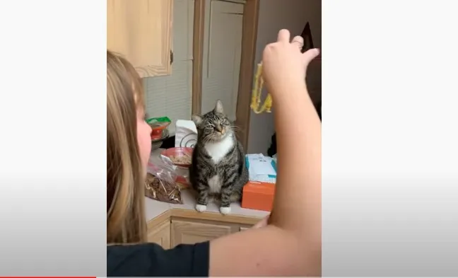 वीडियो में आप देख सकते हैं कि किचन में एक लड़की चीज सेंडविच खा रही है। पास ही बैठी उसकी बिल्ली सैंडविच को देखकर जीभ लपलपा रही है। फिर वो ऐसे मुंह चलाती है जैसे सैंडविच खा रही हो। इस बीच उसकी मालकिन तोड़ तोड़ कर उसे दिखा दिखा कर सैंडविच खा रही है और बिल्ली मायूसी से सैंडविच खत्म होते देख रही है।
