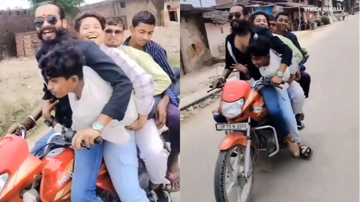 वायरल हो रहे इस वीडियो में देखा जा सकता है कि एक बाइक पर पांच-पांच लोग सवार हैं और वो भी बड़े अटपटे तरीके से। जी हां, आपने सही पढ़ा, पांच लोग। और ये कोई सामान्य सवारी नहीं थी। बाइक को ड्राइव कर रहा युवक खड़े होकर बाइक चला रहा है। बाकी चार भी बाइक पर ऐसे लटके थे जैसे सर्कस के जोकर अपनी परफॉर्मेंस दे रहे हों। उनमें से तो एक बंदा बाइक पर दोस्तों की गोद में लेटा हुआ भी दिख रहा है। वीडियो में ये नजारा देखकर लग रहा था कि ये लोग न तो ट्रैफिक नियमों की परवाह कर रहे थे और न ही अपनी जान की। चलती बाइक पर हाथ फैलाकर, बेतरतीब ढंग से बैठकर, और शायद "वायरल होने" का सपना देखते हुए ये गैंग सड़क पर तूफान मचाने निकला था। लेकिन भाई, सोशल मीडिया पर वायरल तो हो गए, पर साथ में पुलिस की नजरों में भी आ गए।