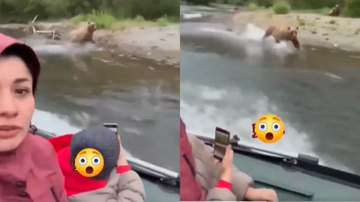वीडियो की शुरुआत में कुछ पर्यटक स्पीड बोट पर सवार होकर नदी के किनारे की सैर का आनंद ले रहे हैं। अचानक, किनारे पर एक भालू दिखाई देता है, जो बोट को देखते ही उसका पीछा शुरू कर देता है। भालू की रफ्तार इतनी तेज है कि वह पानी में उतरकर भी बोट के करीब पहुंचने की कोशिश करता है। बोट पर सवार लोग डर के मारे चीख रहे हैं, और एक बच्चा इस पूरे घटनाक्रम को अपने फोन में रिकॉर्ड कर रहा है। उसके बगल में बैठी महिला भी अपने फोन में इस भयावह दृश्य को रिकॉर्ड कर रही है।