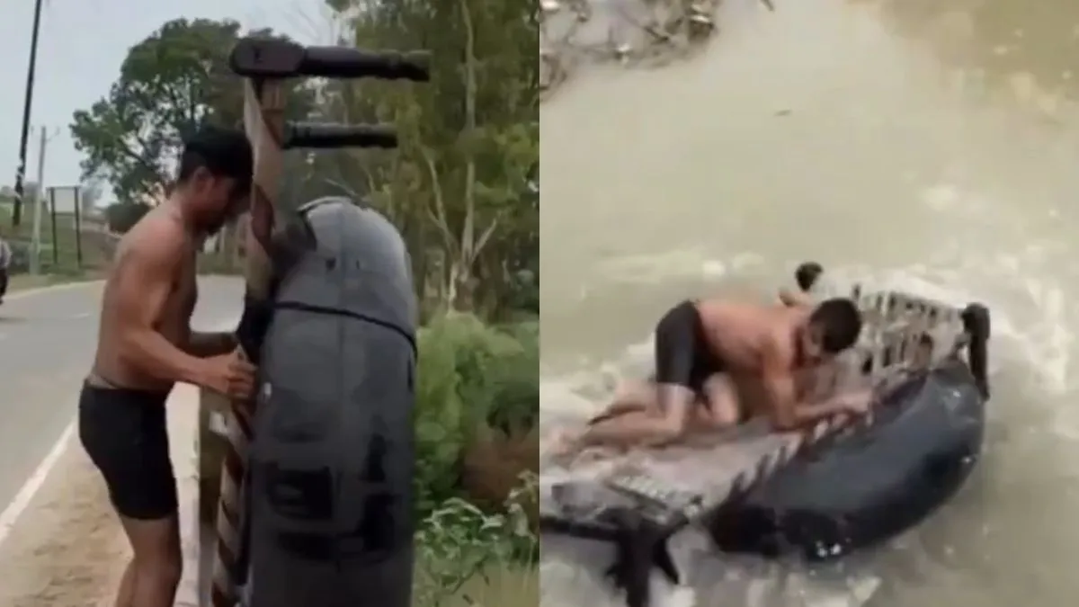 स्विमिंग पूल में आपने देखा होगा कि कई सारे लोग ट्यूब लेकर पानी में उतरते हैं क्योंकि उन्हें तैरने नहीं आता और डूबने का डर रहता है। मगर देसी लोग स्विमिंग पूल में नहीं बल्कि नदीं में कूदते हैं और वो भी अपने अनोखे जुगाड़ के साथ। वायरल वीडियो में नजर आता है कि एक बंदे ने किसी ट्रक या फिर ट्रैक्टर के ट्यूब में हवा भर लिया है और फिर उसके साथ एक खाट भी बांध लिया है। इसके बाद वो उस खाट को पकड़े हुए पानी में कूद जाता है। अब ट्यूब के कारण वो डूबता नहीं है और फिर खाट पर बैठकर पानी के फ्लो के साथ मजे करता है।