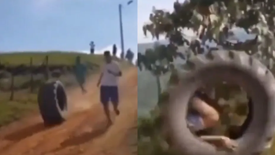 सोशल मीडिया पर एक वीडियो वायरल हो रहा है। उसमें आप देखेंगे कि एक शख्स ऊंचाई से ढलान की तरफ भागते हुए आ रहा है। उसके साथ ही साथ किसी गाड़ी का एक बड़ा सा टायर भी लुढकते हुए नीचे आ रहा है। जब वो टायर नजदीक आता है तो आपको दिखेगा कि उसमें एक शख्स बैठा हुआ है। कुछ समय तक तो सब कुछ ठीक रहता है। मगर अचानक टायर अपना डायरेक्शन बदल लेता है और वो बगल में खाई की तरफ लुढक जाता है। उसे रोकने के लिए उसके दोस्त पीछे भागते हैं मगर टायर की रफ्तार इतनी ज्यादा थी कि उसे रोकना मुश्किल था।