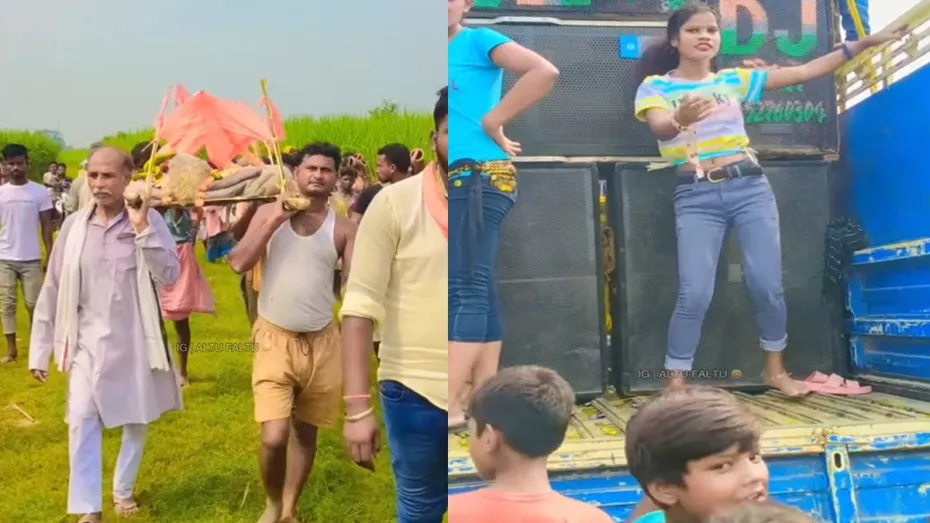 वीडियो में देखा जा सकता है कि एक डेड बॉडी को परिवार के कुछ लोग चार कंधों पर उसे लादकर उसे श्मशान घाट अंतिम संस्कार के लिए ले जा रहे हैं। मृतक की अंतिम यात्रा में परिवार के साथ-साथ गांव के भी लोग चल रहे हैं। लेकिन वीडियो में शव यात्रा के आगे जो कुछ भी देखने को मिला, वह देख लोगों की आंखें चौंधिया गईं। साथ में लोगों को उस परिवार पर हंसी भी आई। वीडियो में आप देख सकते हैं कि शव यात्रा के आगे-आगे एक गाड़ी चल रही है, जिस पर DJ लगाया गया है और उस पर दो महिलाएं डांस करते हुए नजर आ रही हैं। साथ में उस गाड़ी के आस-पास इकट्ठे बच्चे भी DJ पर डांस कर रहे हैं और इस पल को खूब एन्जॉय कर रहे हैं।