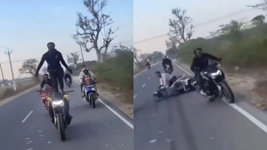 अभी जो वीडियो वायरल हो रहा है उसमें नजर आता है कि कुछ लोग बाइक चलाते हुए जा रहे हैं। उसमें सबसे आगे जो शख्स है वो बाइक पर स्टंट कर रहा है। वो बाइक की सीट पर खड़ा हो गया है और बाइक अपनी रफ्तार में चल रही है। अचानक उसका बैलेंस बिगड़ता है और वो नीचे गिरने लगता है। किसी तरह से वो खुद को संभाल लेता है और गिरने से बच जाता है मगर उसके चक्कर में पीछे बाइक पर आ रहा दूसरा शख्स फंस जाता है। उसका बैलेंस बिगड़ जाता है और वो अपने दोस्त के साथ नीचे गिर जाता है।