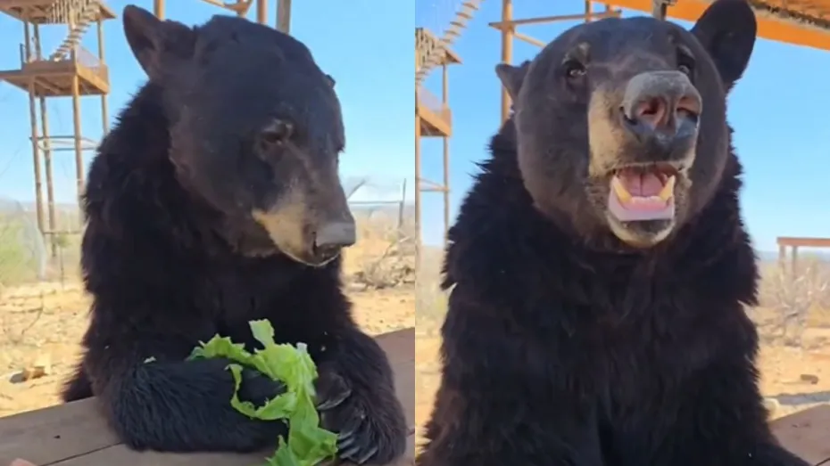 इस वायरल वीडियो में एक भालू को डिनर टेबल पर बैठे हुए दिखाया गया है। टेबल पर गाजर और कुछ सब्जियां रखी गई हैं, जिन्हें वह खाते दिख रहा है। भालू बड़े ही शांत तरीके से बैठकर अपना खाना निपटा रहा है। उसकी हरकतें इतनी सहज हैं कि ऐसा लगता है मानो वह रोजाना इसी तरह डिनर करता हो। वीडियो में बैकग्राउंड से हल्की हंसी और हैरानी भरी आवाजें सुनाई देती हैं, जो बताती हैं कि इसे रिकॉर्ड करने वाले लोग भी इस नजारे से हैरत में हैं। भालू की मासूमियत और उसका इंसानों जैसा व्यवहार इस वीडियो को बेहद खास बनाता है।