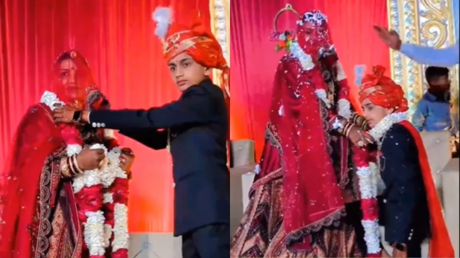 वीडियो में आप देख सकते हैं कि एक महिला लगभग 12-13 साल के लड़के से शादी कर रही है। दोनों एक दूसरे को जयमाल पहनाते हुए नजर आ रहे हैं। पहले बच्चा महिला के गले में जयमाला डालता है फिर वह घुटनों के बल बैठ जाता है फिर दुल्हन वरमाला उसके गले में डाल देती है। अब इस वायरल वीडियो पर कई लोगों ने कमेंट किया। जिनमें से अधिकतर लोगों ने इस वीडियो को सिर्फ रील के लिए बनाया गया एक वीडियो बतया। वहीं, कई अन्य लोगों ने इस वीडियो पर कमेंट कर इस कपल की खूब मौज ली। किसी ने कहा कि छठवीं क्लास के बच्चे को M.A की किताब पढ़ने को दे दी गई है। कुछ अन्य लोगों ने कहा- बाल विवाह अच्छा विकल्प है, मैं अभी 36 साल का हूं और मेरी शादी अभी तक नहीं हुई है। वहीं, कई लोगों ने इस मामले को बालिका वधू सीजन 2024 का सीन बताया।