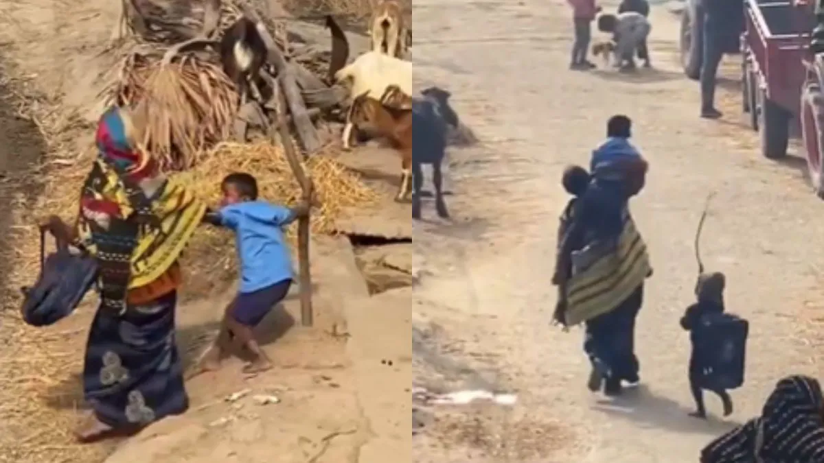 बचपन में लगभग सभी बच्चे स्कूल जाने में नाटक तो करते ही हैं। कुछ बच्चे शुरु-शुरु में स्कूल जाने से मना करते हैं तो कुछ हमेशा मना ही करते रहते हैं तो वहीं कई बार बच्चों का मन नहीं होता है। अब स्कूल और पढ़ाई कितना जरूरी, यह वो तो नहीं जानते हैं मगर उनके मां-बाप जानते हैं इसलिए उन्हें जबरदस्ती स्कूल भेजते हैं। ऐसा ही कुछ वायरल वीडियो में दिखता है। वीडियो में दिखता है कि एक बच्चा स्कूल जाने में नाटक करता है तो पहले तो मां खींचकर ले जाती है मगर जब मां को लगता है कि ये ऐसे नहीं जाएगा तो छोटे बच्चे को उसका बैग पकड़ाती है और उसे टांग कर ले जाती है। कई लोग अपने बचपन में ऐसे ही स्कूल गए होंगे।