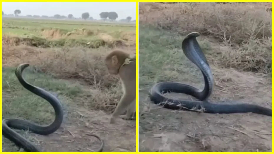 Bandar Aur Sanp Ka Video: सोशल मीडिया पर आए दिन तरह तरह के वीडियो वायरल होते रहते हैं। जंगल में दो जानवरों के बीच की लड़ाई को लोग खूब पसंद करते हैं। जंगल के सबसे जहरीले जानवरों में कोबरा सांप और सबसे शरारती जानवरों में बंदर आता है। अभी हमारे पास जो वीडियो आया है वह एक बंदर और कोबरा सांप का है। कोबरा जब खाली पेट होता है तो वह शिकार पर निकलता है। वह चूहा, गिलहरी, खरगोश समेत कई जानवरों को मारकर खाता है। साथ ही वह कोबरा समेत अन्य कई सांपों को भी मारकर जिंदा निगल जाता है। लेकिन क्या होगा जब कोबरा का पाला एक शरारती बंदर से पड़ जाएगा।