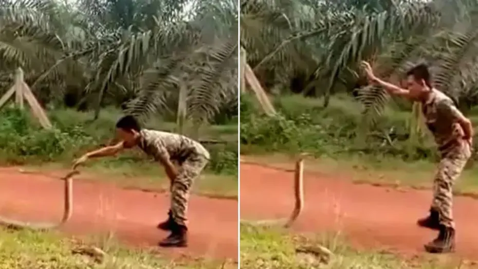 वायरल हो रहे इस वीडियो में आप देख सकते हैं कि एक कोबरा फन फैलाए सड़क पर खड़ा रहता है तभी उसका सामना एक आर्मी के जवान से हो जाता है। जवान सांप को देखकर बिल्कुल भी नहीं घबराता। वह बहुत ही शांती और धैर्य से सांप को पहले अपने काबू में करता है और फिर उसके सामने अपने हाथों को हिलाता है। सांप शख्स के हाथों को देख उसके इशारों पर इधर-उधर घूमने लगता है। इसके बाद जवान सांप के सिर पर अपनी एक उंगली रखता है। फिर जवान सांप को जमीन पर दबाता है और अपने हाथों से उसे पकड़ लेता है। सांप अपने आप को छुड़ाने की बहुत कोशिश करता है लेकिन वह नकाम रहता है।