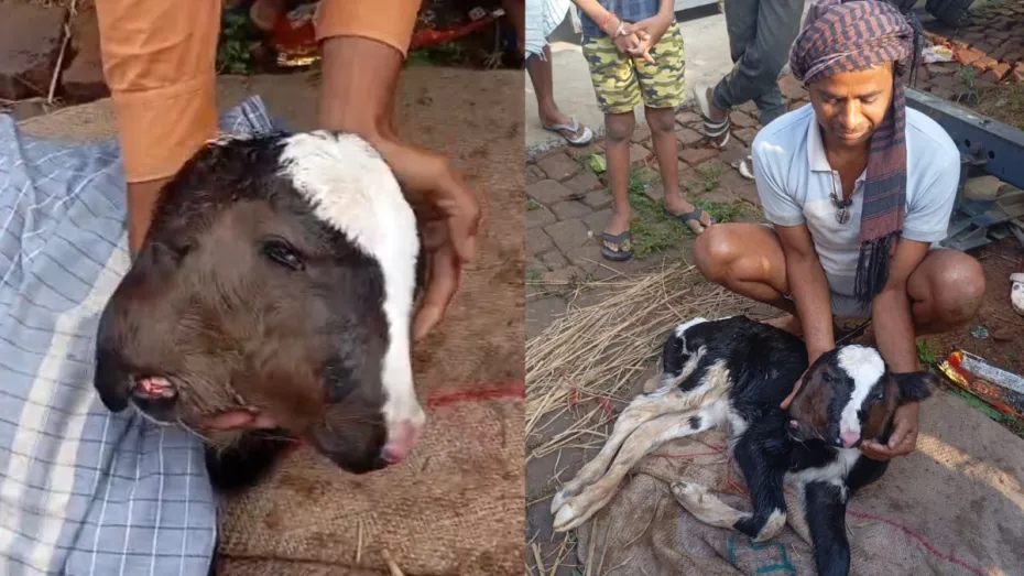 मुंगेर: जिला मुख्यालय से लगभग 40 किलो मीटर दूर एक अनोखा मामला सामने आया है। यहां हवेली खड़गपुर प्रखंड के प्रसंडो गांव में रविवार सुबह एक दुर्लभ घटना सामने आई। यहां स्वर्गीय बैकुंठ सिंह के पुत्र अमित सिंह उर्फ टिंकू की गाय ने दो मुंह और चार आंखों वाले एक बछड़े को जन्म दिया है। इस अनोखे बछड़े को देखने के लिए गांव और आसपास के क्षेत्रों से लोगों की भारी भीड़ उमड़ पड़ी। घटना का वीडियो भी सामने आया है, जिसमें लोगों की भीड़ देखने को मिल रही है। लोगों ने इसे ईश्वर का चमत्कार बताया है।