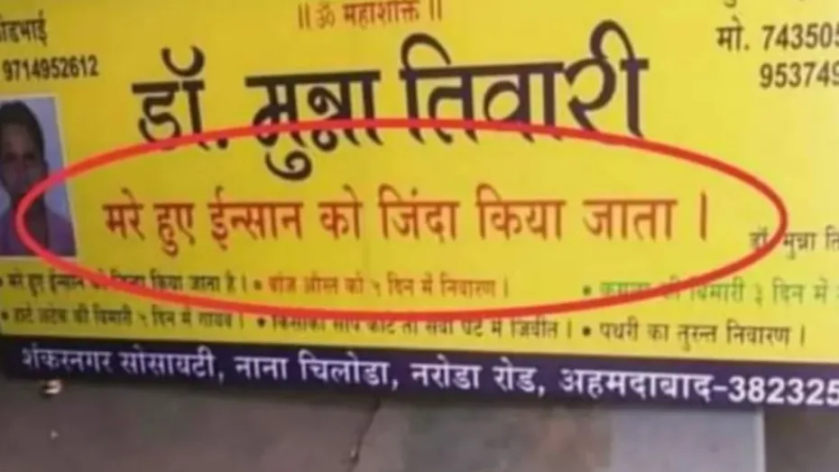 दरअसल, डॉक्टर साहब का एक बिलबोर्ड किसी सार्वजनिक स्थल पर लगा हुआ था। जिसकी तस्वीर क्लिक कर किसी व्यक्ति ने सोशल मीडिया पर पोस्ट कर दी। वायरल बिलबोर्ड पर डॉक्टर साहब ने यह दावा किया कि उनके यहां मरे हुए इंसानों को भी जिंदा किया जाता है। पोस्टर पर डॉक्टर का नाम डॉ. मुन्ना तिवारी लिखा गया है। जिनका पता - शंकरनगर सोसायटी, नाना चिलोड़ा, नरोडा रोड अहमदाबाद बताया गया है। साथ में उनका फोन नंबर भी इस बिलबोर्ड पर लिखा हुआ है। डॉक्टर साहब कई अन्य चीजों का भी दावा कर रहे हैं। जिसमें बांझ औरतों का 5 दिन में निवारण, हार्ट अटैक की बीमारी 5 दिन में गायब, किसी को सांप काटे तो उसे सवा घंटे में जीवित करने का दावा और पथरी जैसी बीमारी का तुरंत निवारण करने की बात कर रहे हैं।