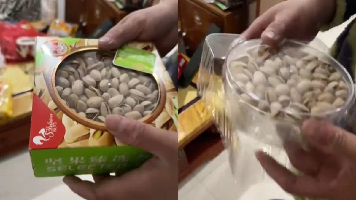अभी जो वीडियो वायरल हो रहा है उसमें एक पैकेट नजर आता है जिसके अंदर पिस्ता रखा हुआ है। पूरा पैकेट तो कागज का है और बीच में पॉलिथीन लगा हुआ है जहां से पिस्ता नजर आ रहा है। इसके बाद वो पैकेट को खोलता है तो हैरान करने वाला नजारा दिखता है। दरअसल जितना पिस्ता पैकेट के बाहर से दिख रहा था, उसमें उतना ही था और बाकी में खाली बॉक्स था। इसके बाद एक और खुलासा होता है। जिस सर्कल वाले बॉक्स में पिस्ता रखा हुआ था, उसमें बस ऊपर वाले लेयर में पिस्ता था और नीचे से पूरा खाली थी। कुल मिलाकर यह ग्राहकों के साथ धोखा है।