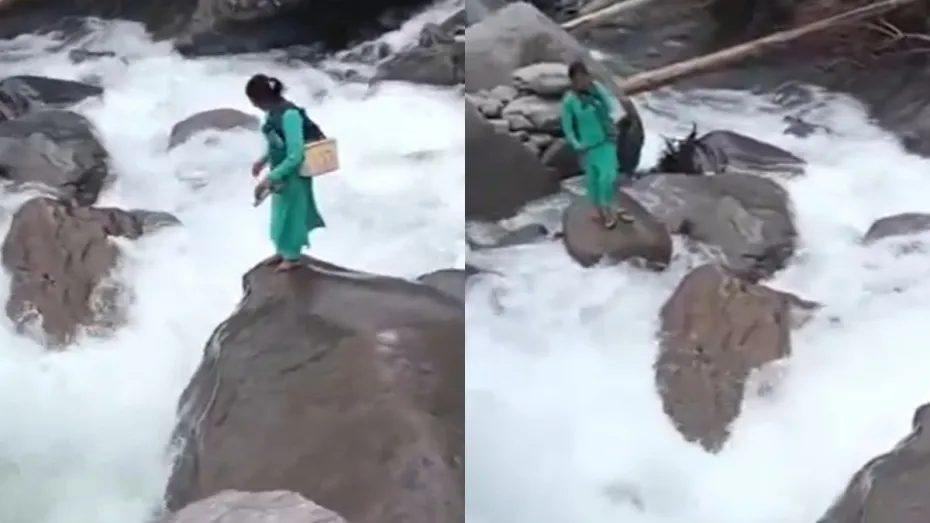 अभी जो वीडियो वायरल हो रहा है उसमें नजर आता है कि महिला एक नाले के पत्थर पर खड़ी है। उस नाले में पानी का बहाव तेज है। नाला उफान पर है और वहीं बीच में नजर आता है कि वो महिला चप्पल को निकालकर हाथ में ले लेती है और फिर किनारे पर चली जाती है। कुछ देर बाद वो महिला सामने दिख रहे दूसरे पत्थर पर कूद जाती है। अगर थोड़ा सा भी बैलेंस बिगड़ता तो महिला पानी के बहाव के साथ बह जाती मगर राहत की बात है कि ऐसा कुछ नहीं हुआ है। इसके बाद महिला अगले पत्थर पर कूदती है और फिर वहां से निकल जाती है।