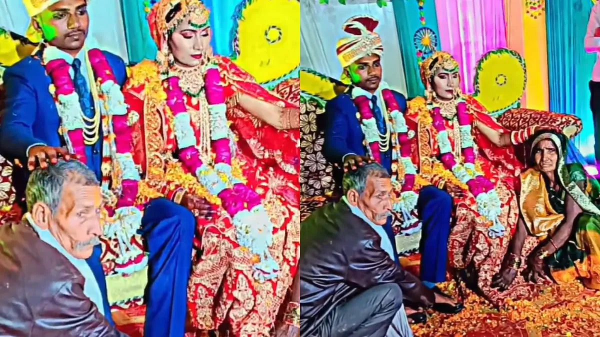 आप अब तक कई बार शादी में गए होंगे। आप भी शायद शादीशुदा इंसान होंगे। आपने देखा होगा कि शादी के समय स्टेज पर जब कोई बुजुर्ग कपल जाता है तो दूल्हा और दुल्हन उनका आशीर्वाद लेते हैं और वो भी अपना हाथ उनके सिर पर रखते हुए खुले दिल से आशीर्वाद देते हैं। मगर वायरल हो रहे वीडियो में तो बिल्कुल अलग ही देखने को मिल रहा है। वीडियो में नजर आता है कि दूल्हा और दुल्हन सोफे पर बैठे हुए हैं और बुजुर्ग कपल उनके पैर छू रहे हैं। दूल्हा और दुल्हन भी उन्हें आशीर्वाद देते हुए नजर आ रहे हैं। अब यह वीडियो कहां का है और कब का है, इसकी जानकारी तो नहीं दी गई है मगर वायरल हो रहा है।