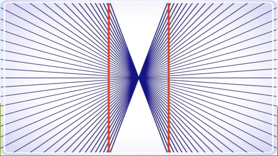 यदि आपको इसका उत्तर मिल गया तो सही बात है। अगर नहीं मिला है तो चलिए हम आपको इसका उत्तर बता देते हैं। जैसा कि आप तस्वीर में देख रहे हैं कि बाएं और दाएं दोनों तरफ से बहुत सारी नीली रेखाएं खींची गईं हैं जो कि एक बिंदु पर जाकर मिल रही हैं। उसके ऊपर दो लाल रंग की रेखाएं सीधी खींची गईं है। अब आपको यही बताना था कि ये रेखाएं सीधी हैं या टेढ़ी? लगभग सभी ने यही उत्तर दिया था कि ये दोनों रेखाएं टेढ़ी हैं। देखने में भी ये टेढ़ी ही लग रही हैं। लेकिन आपको बता दें कि खींची हुई दोनों लाल लाइन बिल्कुल सीधी हैं और दोनों एक दूसरे के समानांतर हैं। यकीन न हो तो स्केल से मिलाकर देख लीजिए।