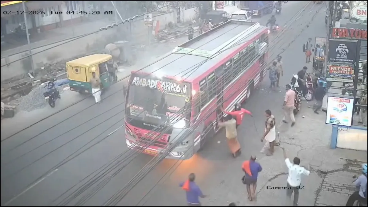 केरल के पलक्कड़ जिले के ओट्टपालम में मंगलवार को एक बड़ा सड़क हादसा होने से टल गया। पलक्कड़-गुरुवायूर रूट पर चल रही एक निजी बस में अचानक भीषण आग लग गई। बस में पहले से आगे से धुआं निकलने लगा और फिर आग लग गई। इसी दौरान वहां से गुजर रहे एक एक ऑनलाइन डिलीवरी एजेंट युवक ने ऑटोमैटिक दरवाजे पर लात मारकर उसे तोड़ दिया।