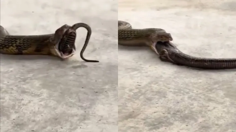 कोबरा कितना खतरनाक हो सकता है आप इस वायरल हो रहे वीडियो से ही अंदाजा लगा सकते हैं। जहां एक किंग कोबरा एक साथ तीन-तीन विशालकाय सांपों को निगल लिया था। बाद में कोबरा ने उन तीनों सांपों को एक साथ उगल दिया। वीडियो में यह साफ तौर पर दिख रहा है कि किंग कोबरा अपने मुंह में सांपों को भरे हुए है और वह उल्टी कर रहा है। उल्टी करने के दौरान किंग कोबरा धीरे-धीरे पीछे की ओर खसकते जा रहा है और उसके मुंह से एक-एक कर तीन विशालकाय सांप निकलते जा रहे हैं।