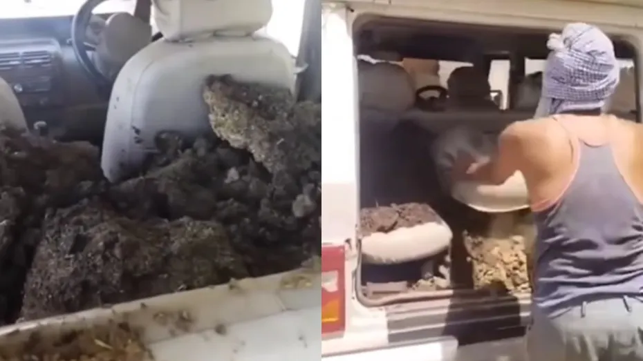 वीडियो में दिख रही बोलेरो आगे से लेकर पीछे तक पूरे गोबर से भरी हुई है। सिर्फ ड्राइवर की सीट वाली जगह खाली है। वीडियो में आप देख सकते हैं कि शख्स एक तसले में गोबर भर-भरकर उस बोलेरो गाड़ी में फेंकते जा रहा है। गाड़ी में गोबर ढोना और उसे इस कदर गंदा करना किसी भी इंसान को चौंका सकता है। यह नजारा देख लोगों को समझ में नहीं आया कि आखिर ये इंसान ऐसा क्यों कर रहा है।