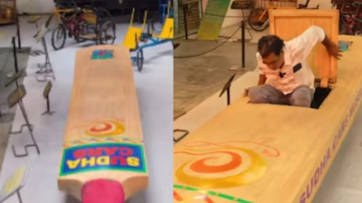 Viral Video: हैदराबाद के सुधा कार्स म्यूजियम में एक संग्रहालय के असाधारण आविष्कार ने लोगों को चौंका दिया। जब एक वीडियो में 21 फुट लंबे क्रिकेट बल्ले को इंजन वाली कार में बदलते हुए दिखाया गया। इस अविश्वसनीय चीज को हैदराबाद के सुधा कार्स म्यूजियम ने साकार किया। इंस्टाग्राम पर वायरल हुए एक वीडियो ने विशालकाय चमगादड़ से बने वाहन को लोगों के ध्यान में ला दिया। चमगादड़ का अंतहीन सा दिखने वाला आकार अपने आप में विचित्र था लेकिन फिर संग्रहालय के एक कर्मचारी ने यह बताकर लोगों को अवाक कर दिया कि यह वास्तव में एक इंजन वाली कार है।