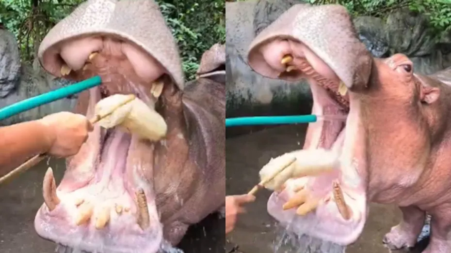 दरियाई घोड़े का दांत साफ करने का वीडियो वायरल
