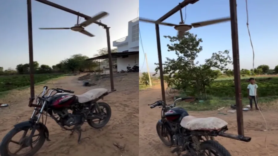 वायरल हो रहे शख्स के इस जुगाड़ी वीडियो में आप देख सकते हैं कि शख्स ने गर्मी से बचने के लिए अपनी बाइक पर पंखा लगा लिया है। लेकिन सोचने वाली बात तो यह है कि जब बाइक चलती है तो अपने आप ही हवा लगते रहती है तो ऐसे में इस पंखे का क्या काम। खैर सोचने का काम सोशल मीडिया पर ऐसे वीडियो देखने वाले लोगों के लिए है ही नहीं। वीडियो में देखा जा सकता है कि एक पुरानी डिस्कवर बाइक में वेल्डिंग कर के एक लोहे का रॉड लगाया गया है। जिसके बीचोबीच पंखे को लटकाया गया है। बाइक पर लगा हुआ फैन गर में लगने वाला सीलिंग फैन है। पंखा बाइक के पीछे से होते हुए स्विच बोर्ड से एक तार के जरिए कनेक्ट है।