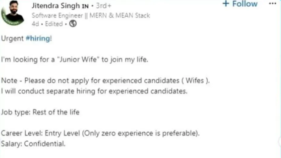 इन भाईसाहब को चाहिए 'Junior Wife' तो लिंक्डइन पर डाल दिया पोस्ट, अब स्क्रीनशॉट हो रहा है वायरल