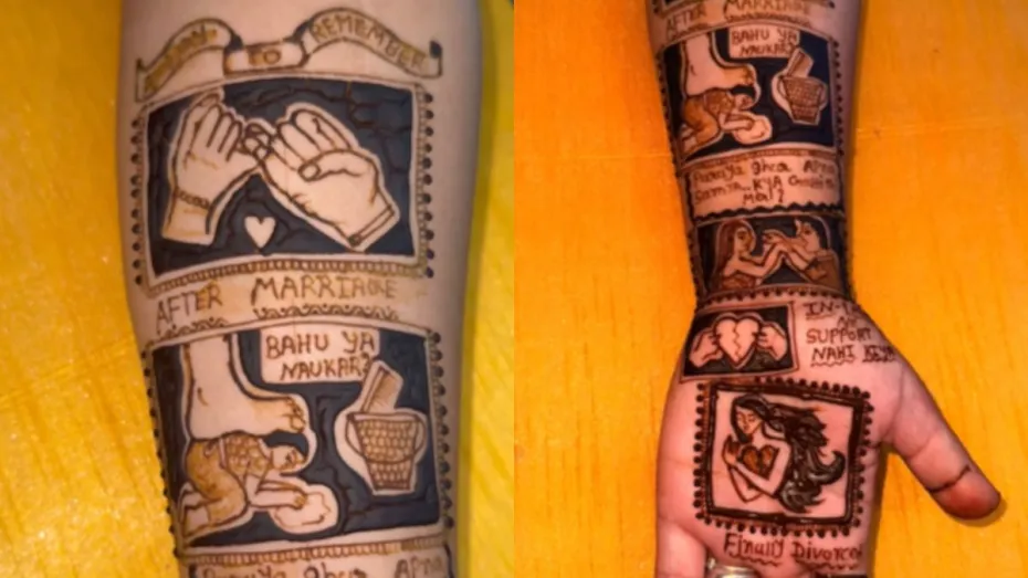 इस मेहंदी डिजाइन से लिखी गई स्टोरी में बताया गया कि उस दिन हमारी शादी हुई, जो कि एक यादगार दिन था। फिर शादी के बाद मुझे नौकरानी समझा गया। नीचे मेहंदी की डिजाइन में लिखा है कि पराया घर अपना समझा… क्या गलती थी मेरी? महिला ने आगे बताया कि उसके सास-ससुर ने उसका सपोर्ट नहीं किया और आखिरकार उसका डिवोर्स हो गया। अपनी शादीशुदा जिंदगी के खत्म होने की कहानी को महिला ने बहुत ही शॉर्ट में मेहंदी के जरिए लोगों को समझा दिया।