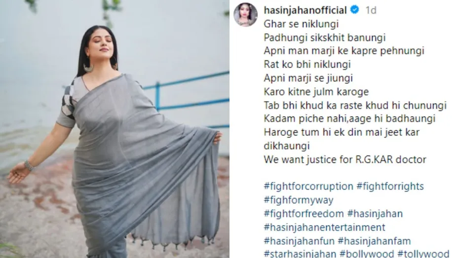 सोशल मीडिया पर हसीन जहां को जो पोस्ट वायरल हो रहा उसमें उनकी एक तस्वीर के साथ कैप्शन में कुछ लाइनें हैं जिसे उन्होंने बलात्कारियों को चुनौती देने के लिए लिखी है। पोस्ट में उन्होंने लिखा है, 'घर से निकलूंगी, पढ़ूंगी शिक्षित बनूंगी। अपनी मन मर्जी के कपड़े पहनूंगी। रात को भी निकलूंगी, अपनी मर्जी से जीऊंगी। करो कितने जुल्म करोगे, तब भी खुद का रास्ता खुद ही चुनूंगी। कदम पीछे नहीं, आगे ही बढ़ाऊंगी। हारोगे तुम ही एक दिन, मैं जीत कर दिखाऊंगी। आरजी कर डॉक्टर के लिए हमें न्याय चाहिए।'