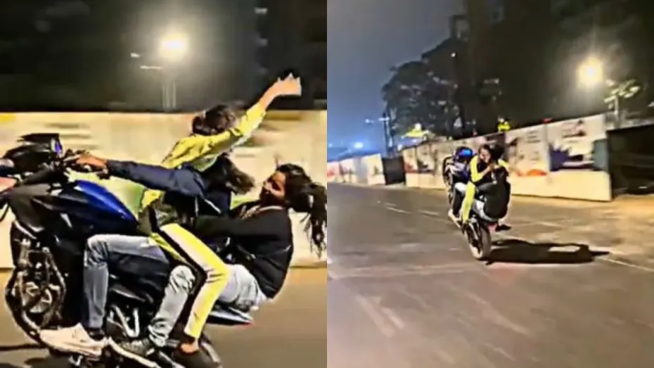 मुंबई की सड़कों पर दो लड़कियों को आगे-पीछे एक ही बाइक पर स्टंट करते हुए युवक का वीडियो वायरल हुआ है। वीडियो को देखने के बाद मुंबई पुलिस ने तीनों के खिलाफ मामला दर्ज किया है। सोशल मीडिया पर वायरल हो रहे इस क्लिप में युवक अपने आगे टंकी पर एक लड़की को बैठाया हुआ है और पीछे भी एक लड़की उसे जोर से पकड़कर बैठी हुई है। साथ ही युवक दोनों को बैठाकर तेज बाइक भगाते हुए आता है और बाइक से व्हीली मारकर दिखाता है। युवक बाइक की आगे वाले पहिए को उठाकर कई मीटर तक चलाता है।