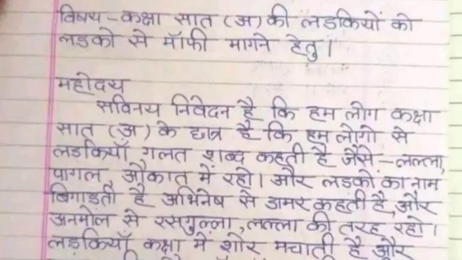 छात्रों ने चिट्ठी में लिखा, “सविनय निवेदन है कि हम लोग कक्षा सात के छात्र हैं... हम लोगों से लड़कियां गलत शब्द कहती हैं, जैसे-लल्ला, पागल, औकात में रहो।” इतना ही नहीं, इन लड़कियों ने अभिषेक को ‘डामर’ और अनमोल को ‘रसगुल्ला’ जैसे क्रिएटिव निकनेम्स भी दे डाले हैं। और तो और, ये लड़कियां क्लास में शोर मचाती हैं, गाना गाती हैं, और डायलॉगबाज़ी करती हैं, जैसे “ओम् फोम् धर्राटे काट रही हैं।” चिट्ठी के आखिर में लड़कों ने बड़े ही सलीके से ‘सधन्यवाद’ लिखकर उन ‘शोर मचाने वाली’ लड़कियों के नाम भी लिखकर दिए हैं। इन लड़कियों के नाम हैं- जानवी, शिखा, रितु, काजल और अवनी।