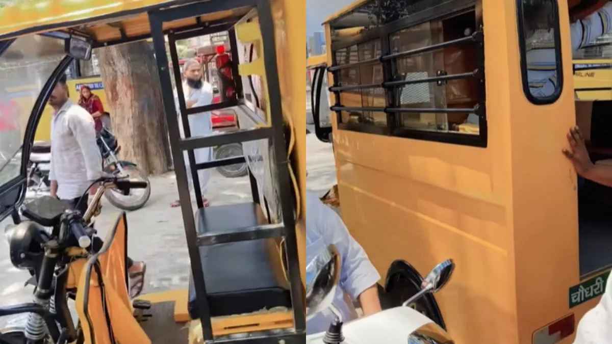अभी जो वीडियो वायरल हो रहा है उसमें शख्स एक ई-रिक्शा के नए वर्जन को दिखाता है। वो स्कूल बस जैसा नजर आता है जिसमें पीछे बहुत सारे लोगों के बैठने की व्यवस्था की गई है। शख्स दिखाता है कि पीछे बस जैसा ही बना हुआ है जिसमें साइड में सीटें लगी हुई हैं। वहीं आगे से वैसा ही है जैसी नॉर्मल ई-रिक्शा होती है। वीडियो बनाते हुए शख्स बोलता है, 'लो भाइयों निकल गया 8वां अजूबा टिर्री का। ये टिर्री, ये ना जीने दे किसी को भी।' आप जब उसे पीछे से देखेंगे तो आप भी पहली नजर में उसके किसी स्कूल का पिकअप वैन ही समझेंगे।