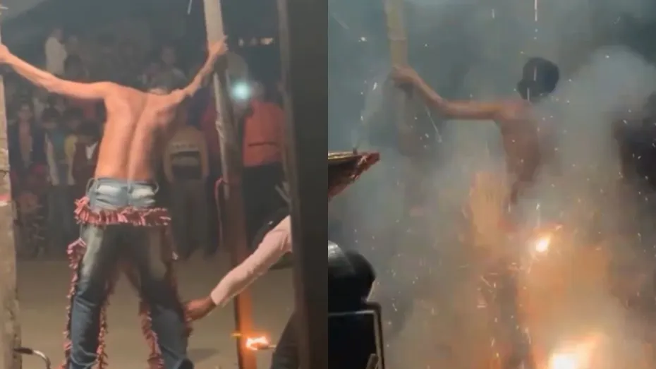 अभी जो वीडियो वायरल हो रहा है उसमें नजर आता है कि एक जगह पर दो खंभे लगे हुए हैं और नीचे एक साइकिल लिटा रखी है जिसके ऊपर एक लकड़ी का फट्टा है। उसी फट्टे पर एक शख्स खड़ा है और उसने अपने दोनों हाथों से खंभों को पकड़ा हुआ है। वहीं उस शख्स के कमर और पैर पर पटाखों की लड़ी लटकी हुई है। अब एक शख्स से वो उसमें आग लगवाता है और फिर पटाखें जलने शुरू होते हैं। उस शख्स को देखकर पता चलता है कि उसे बहुत तकलीफ हो रही है मगर किसी मजबूरी के कारण शायद उसे ऐसा करने लोगों का मनोरंजन करना पड़ता होगा क्यों वीडियो में बहुत सारे लोग सामने खड़े होकर उस आदमी को देखते हुए नजर आ रहे हैं।
