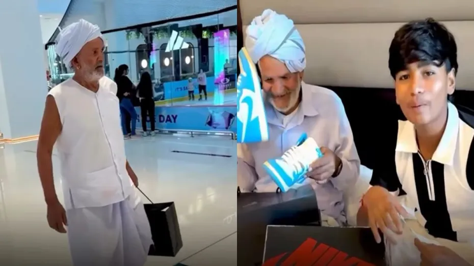 सोशल मीडिया पर आए दिन कोई न कोई वीडियो वायरल होता रहता है, लेकिन कुछ वीडियो ऐसे होते हैं जो दिल को छू जाते हैं। हाल ही में एक ऐसा ही वीडियो इन दिनों सोशल मीडिया पर जमकर वायरल हो रहा है। यह वीडियो दुबई मॉल का है। जहां एक पोता अपने दादा जी को NIKE के जूते दिलाने ले गया। दुबई मॉल में लड़के के दादा जी धोती-कुर्ता पहने बिल्कुल देसी स्वैग में नए जूतों के साथ टहलते नजर आए। उनका पोता उनके साथ ही उनका वीडियो बनाते दिखा। अपने पोते के साथ Nike के जूते खरीदने गए दादा जी का देसी स्वैग देखकर लोग हैरान रह गए। वीडियो में आप देख सकते हैं कि लोग कैसे उन्हें पीछे मुड़-मुड़कर बार-बार देख रहे हैं।