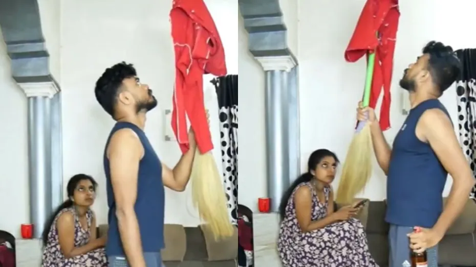अभी जो वीडियो वायरल हो रहा है उसमें नजर आता है कि एक महिला एक सोफे पर एक किनारे बैठी हुई है और फोन को चला रही है। तभी उसे दिखता है कि उसका पति झाड़ू के ऊपर कोई कपड़ा लटकाए हुए ऊपर की तरफ देखते हुए आगे जा रहा है। उसकी पत्नी उसे देखती है और सोचती है कि ये सब क्या है। इसके बाद वो अपने फोन में लग जाती है। उसके बाद दिखता है कि उसका पति उधर से वापस आ रहा है और बिल्कुल उसी तरीके से आ रहा है। इस बार फर्क इतना है कि दूसरा हाथ खाली नहीं है और उसमें शराबी की बोतल है। शख्स ने बोतल को छिपाकर लाने के लिए यह सब ड्रामा किया।